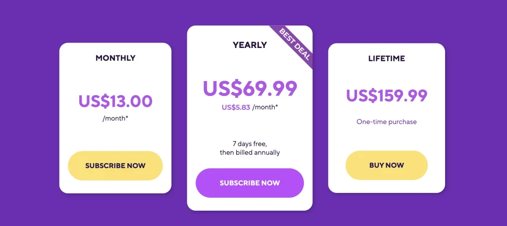 Drops has three different pricing tiers: monthly, yearly, or lifetime. The longer your subscription, the better deal you get. A Premium subscription costs $13.00 per month, the yearly price is $69.99 ($5.83 per month), and a lifetime subscription is $159.99.