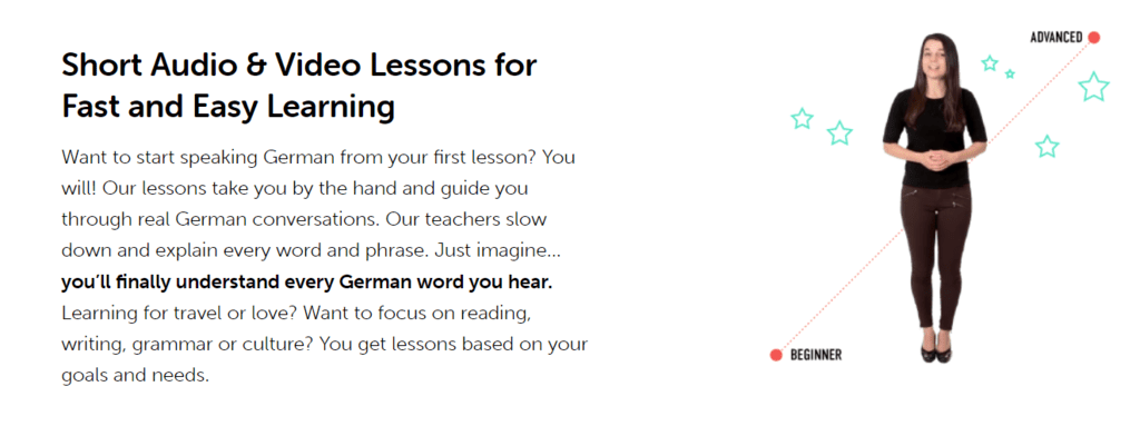 With GermanPod101, you listen to dialogues between native German speakers. The lessons are short and easy to complete. The teachers explain vocabulary and grammar through the context of German culture, such as daily life, work, and food. This is one of the best aspects of it! The lessons do a good job of explaining new concepts too. There aren’t many activities to reinforce what you learn in the lessons though.