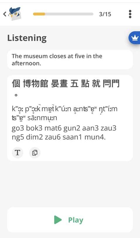 Glossika is an excellent supplement to more formal Cantonese lessons, but you won’t improve all of your skills by only using Glossika. The platform shows each sentence using written characters, and you can choose between four different phonetic spellings. Since Cantonese is a tonal language, most of the phonetic spellings use numbers to help you understand what the different tones are.
