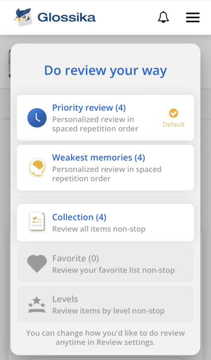 Review Mode is the other way Glossika helps you practice your target language, and I enjoyed using it. Glossika uses artificial intelligence (AI) to create a personalized experience for you. It predicts when you’ll forget a word or phrase, and right before that point, you’ll review it to reinforce your learning.