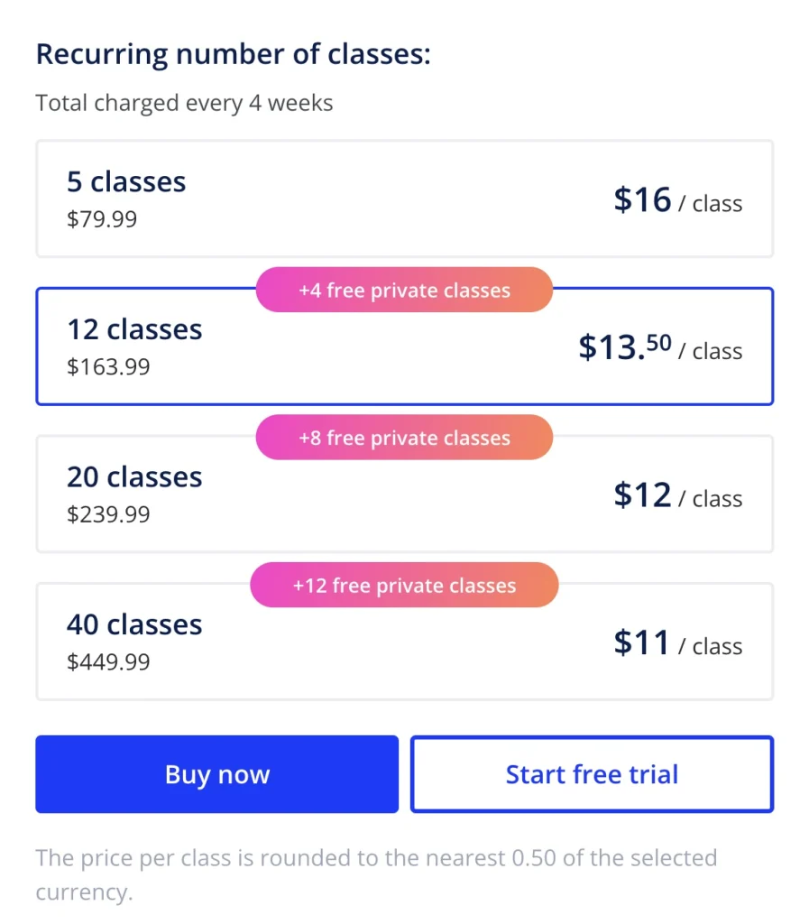 The most flexible way to take Lingoda classes is the monthly subscription, which costs between $79.99 and $1199.99 per month. When you choose this subscription, you can take between 5 and 40 classes each month. There’s no penalty for taking fewer classes, and you can buy more lessons if you want them. The table below shows the monthly subscription price for Lingoda group classes.