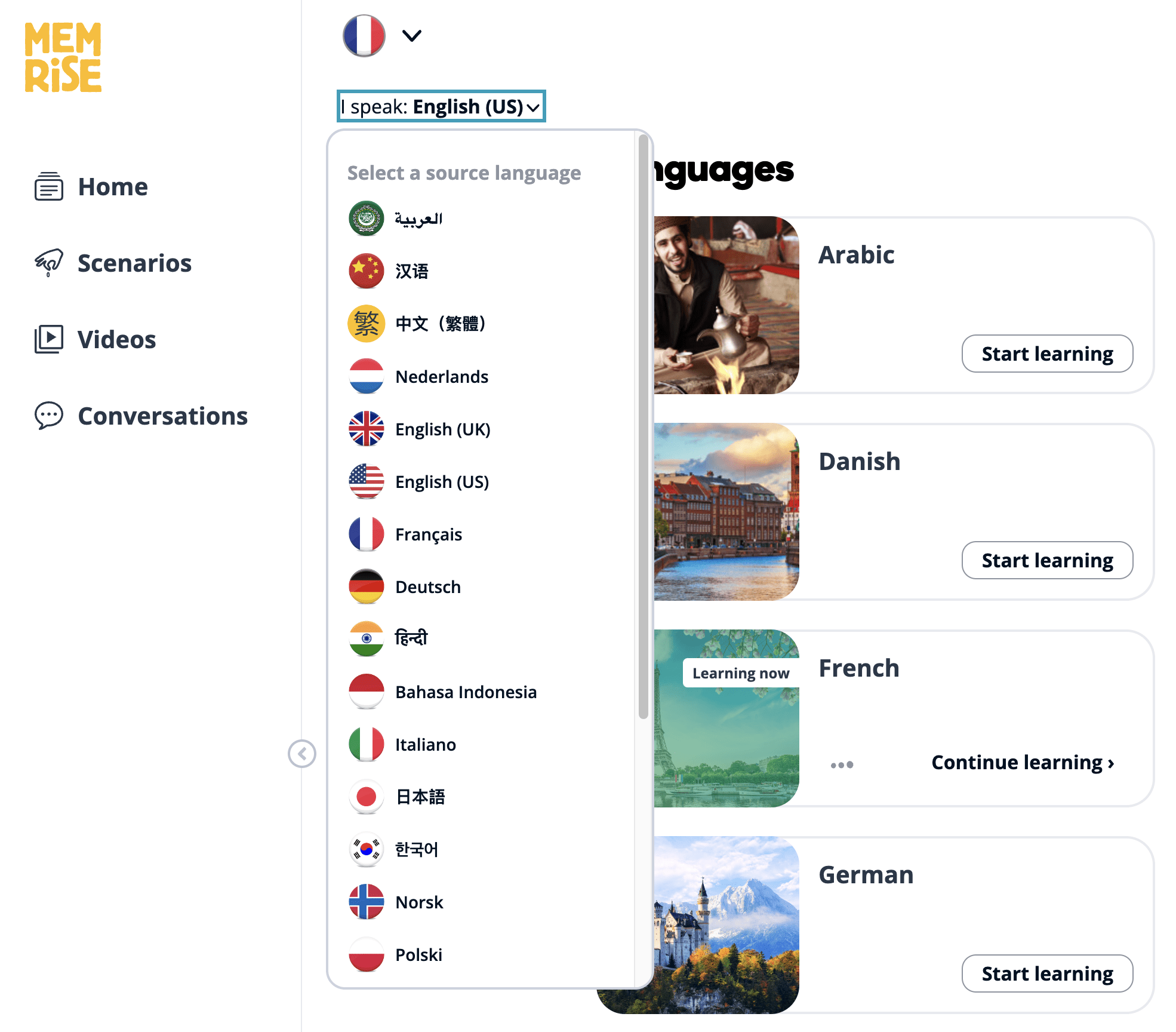 You can sign up for Memrise on the website or app. Both are connected, so once you sign up for your account, you can use either device. The first step is to choose the language you speak and what language you want to learn.