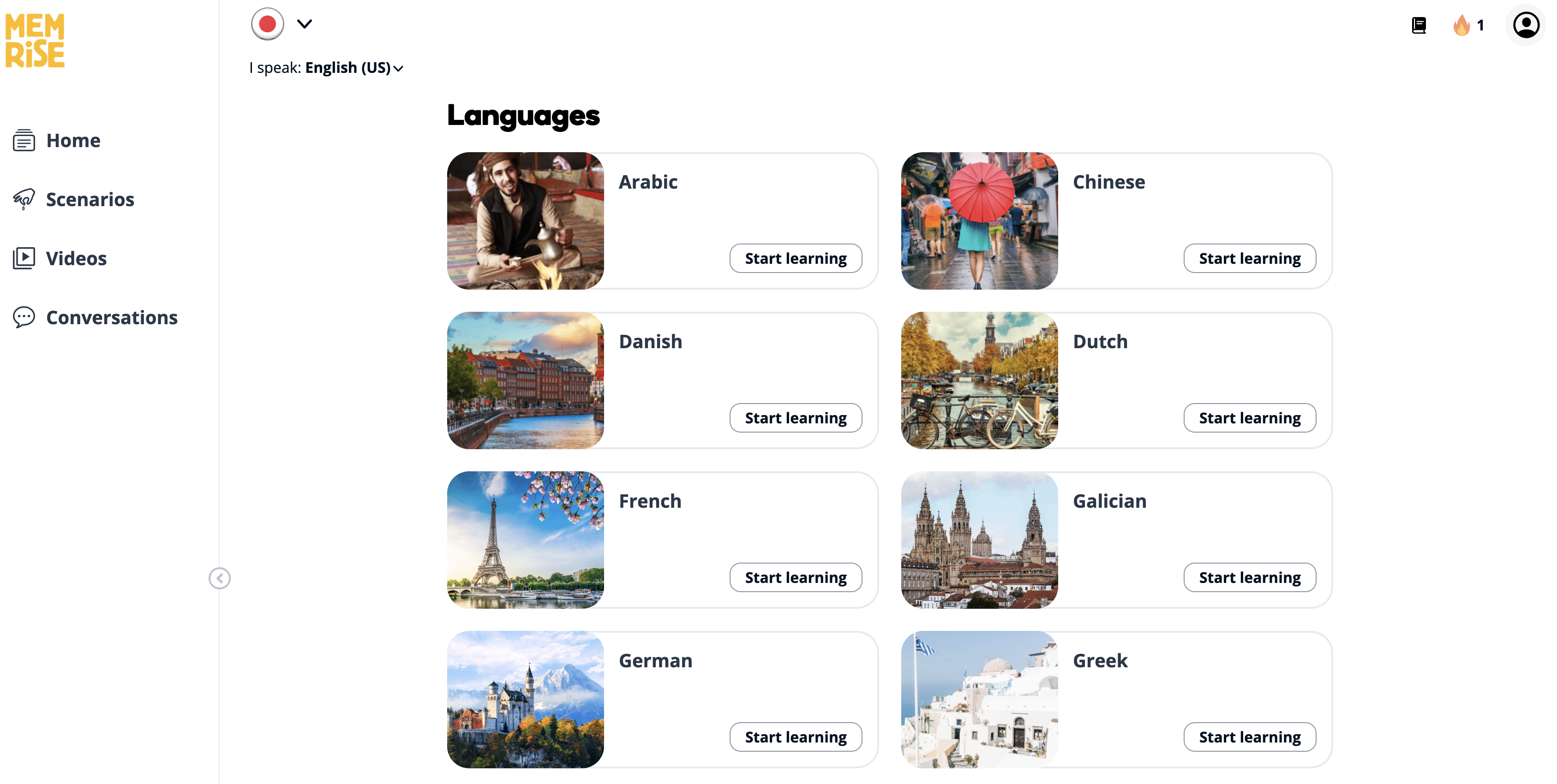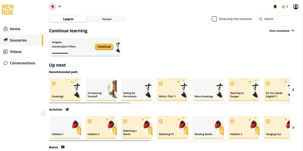 Now, Memrise language courses don’t really go by levels. Instead, they’re broken down into “Scenarios.” Each scenario includes hundreds of vocabulary lists, videos, and conversations. There are two tabs in each course: Learn and Review. Memrise gives you a recommended path, but you can also choose which vocabulary lists or scenarios you want to study.