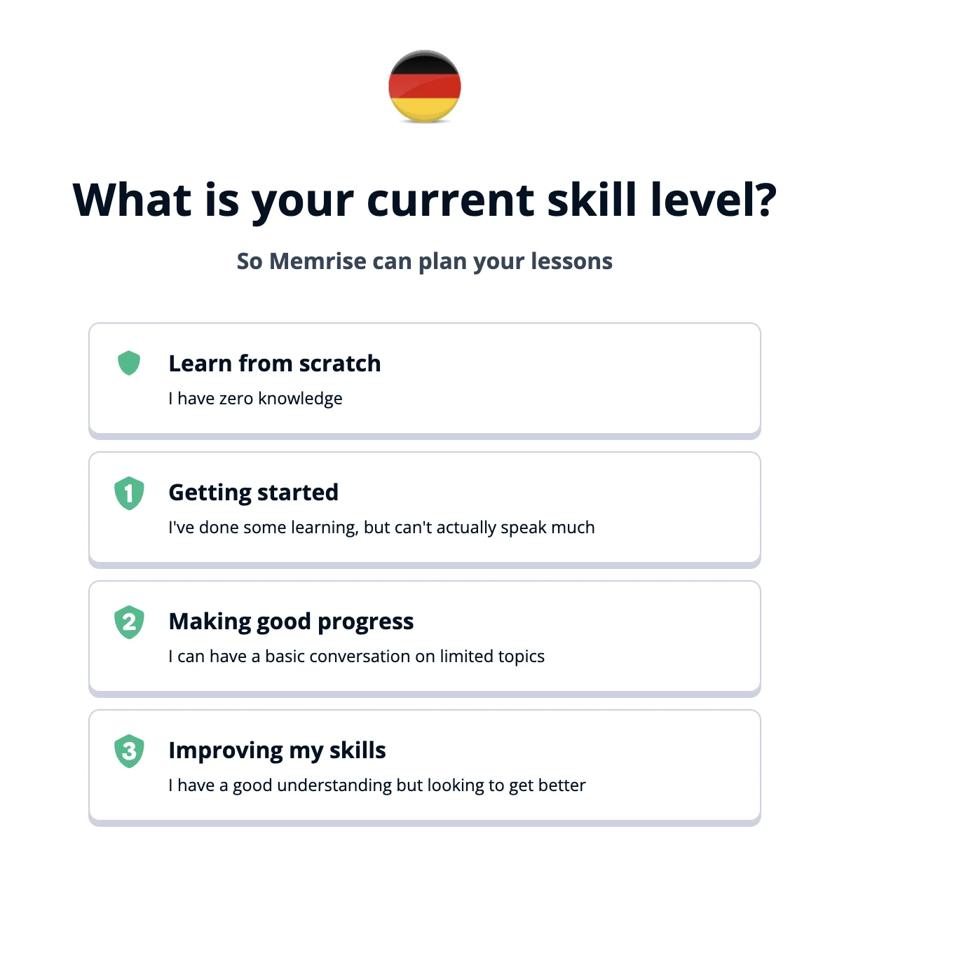 After you select what language you speak and what language you want to learn, Memrise asks what level you’re at in your target language. Then you jump right into learning! Instead of walking you through a tutorial, you can go directly to your first lesson.
