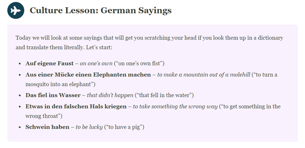 I also like the cultural aspect that they bring into the lessons. First, they use real people to voice the dialogues and they are native German speakers. They also have pictures of the places that they are talking about. The grammar lessons include interesting cultural topics such as unique phrases and the difference between formal/informal language.