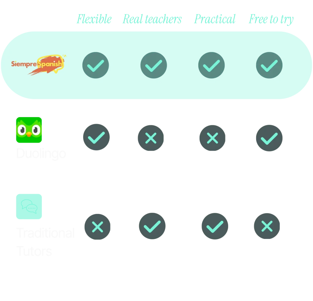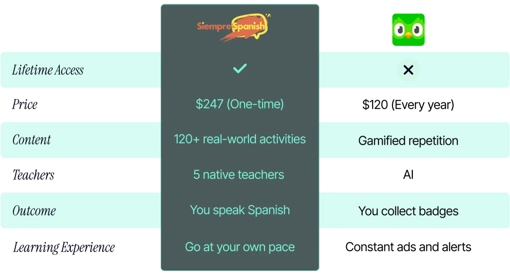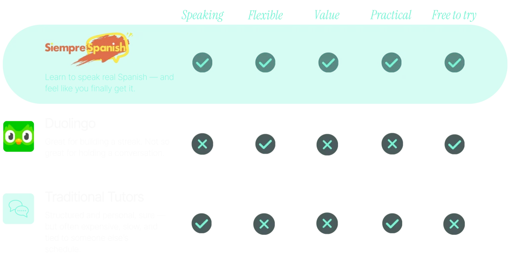 Let’s be real: you can have a 900-day Duolingo streak and still freeze up when someone says “Hola, ¿cómo estás?”. Siempre Spanish is made for people like you, who are done with gamified apps, AI-generated learning and are ready to actually speak Spanish in the real world.
