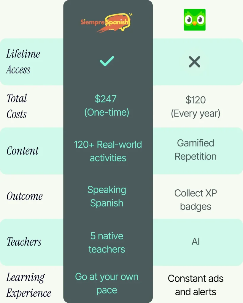 I learned more in the first few lessons of Siempre Spanish than I did during my 500 day Duolingo streak! I wish I would’ve found this course soon.